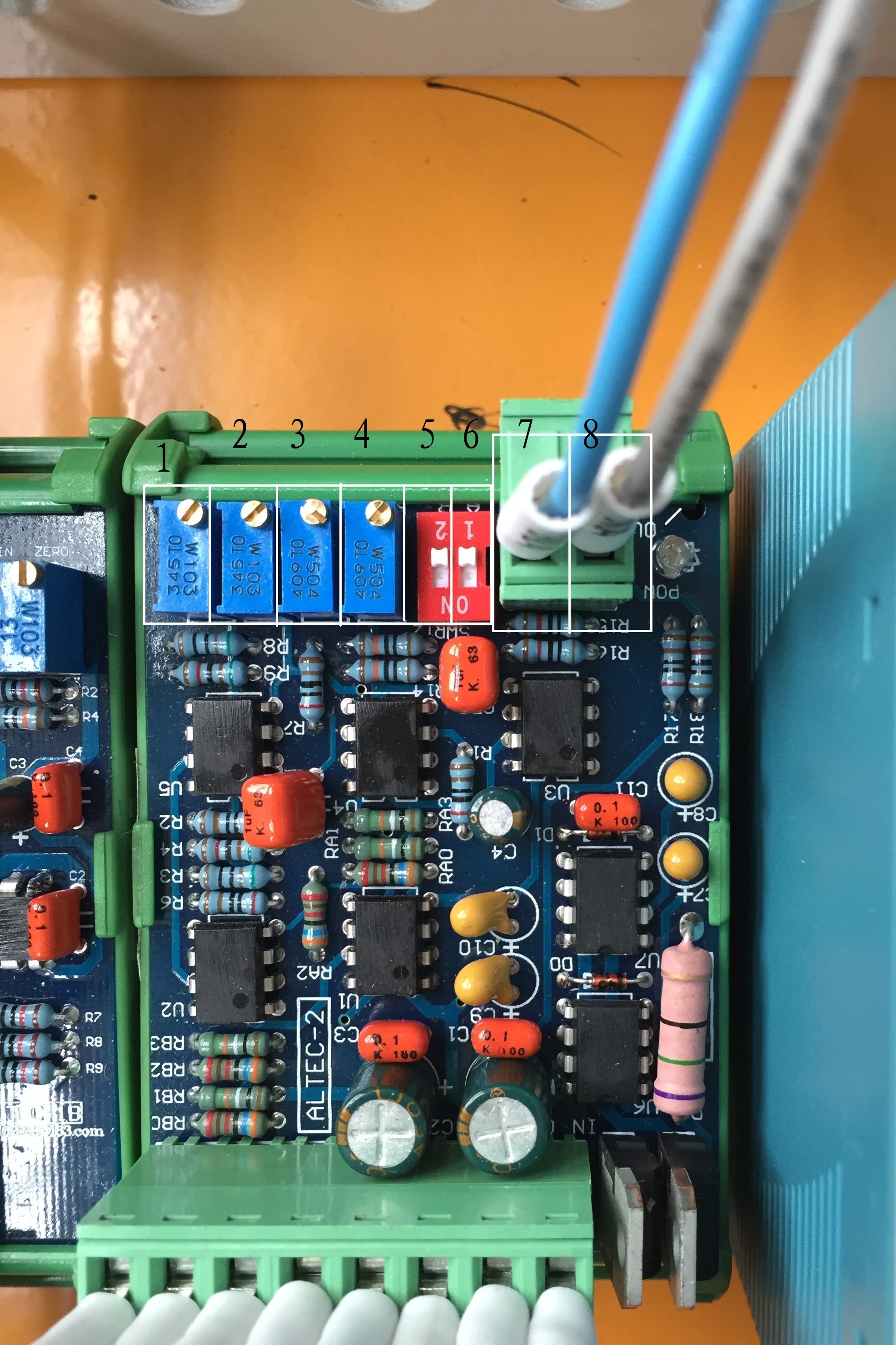 2. 用电流表直流电压档测量(图上7,8号角8号为+,7号为-),将拨档1拨为ON状态(图上6号位置)拨档2拨为OFF状态(图上5号位置),调节(图上4号位置电位器)使电压值为2.5V以上,将拨档1拨为OFF状态,拨档2拨为ON状态,调节(图上3号位置电位器)使电压值为2.5V以上。